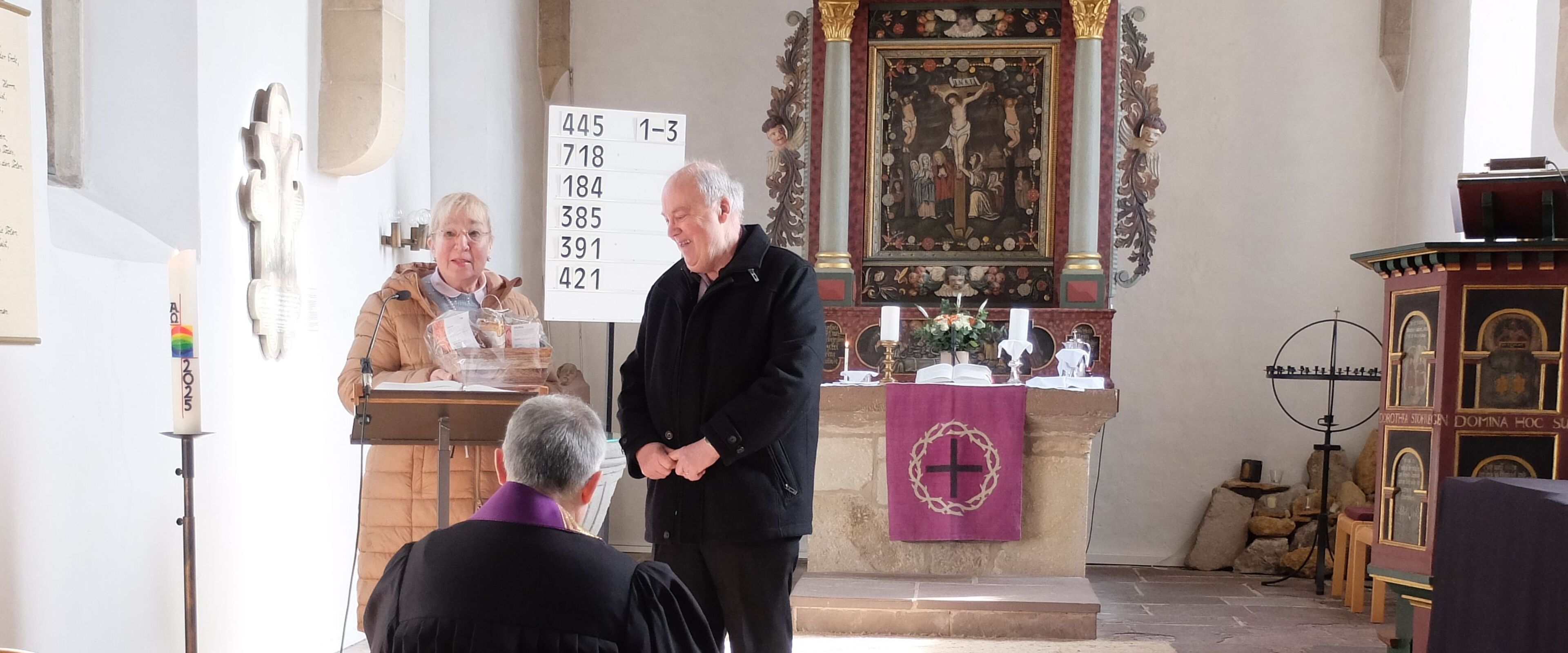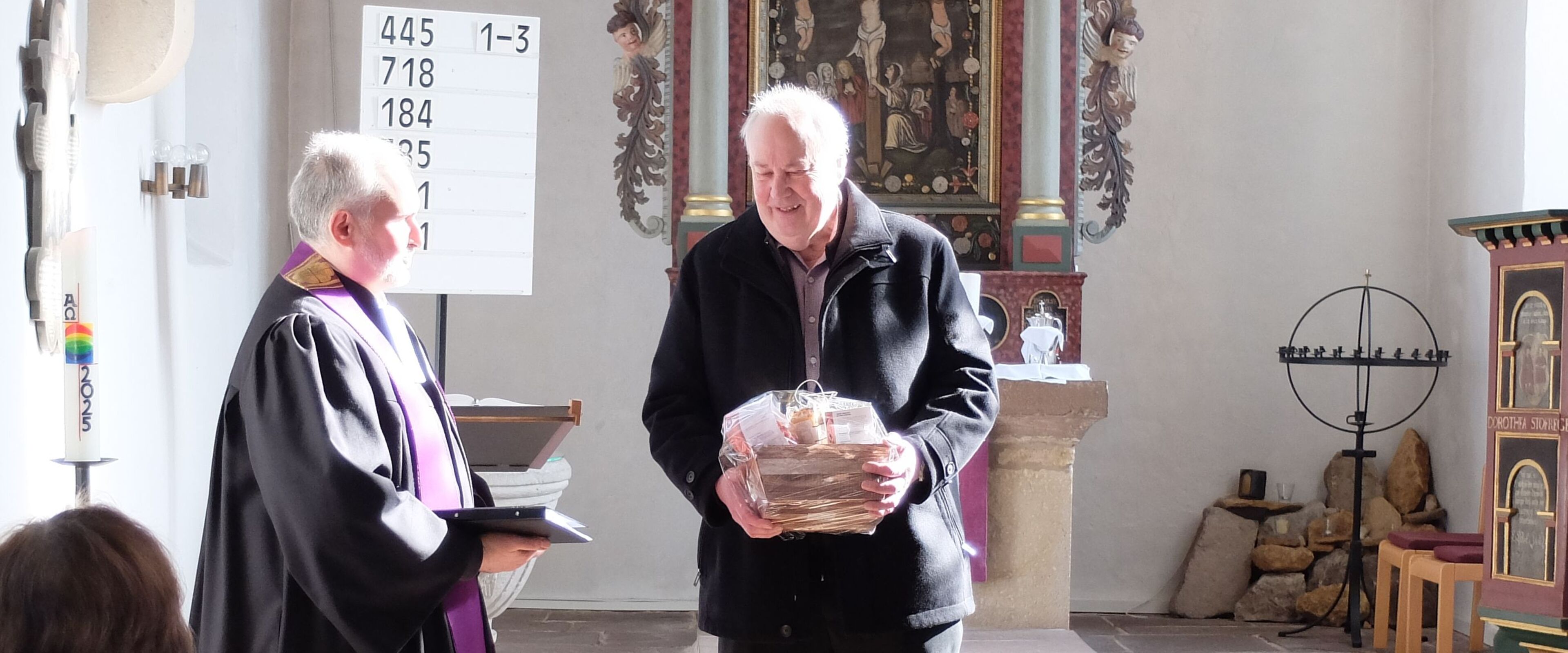 Kirchenvorsteherin Kirsten Kechel überreicht ein Präsent zur Verabschiedung an Wolfgang König. Mehr erfahren