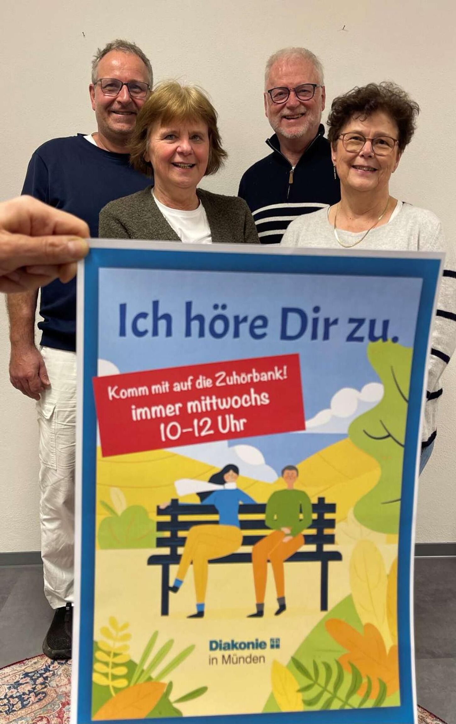 Ehrenamtliche der Diakonie in Münden stehen demnächst regelmäßig bereit, ein offenes Ohr zu haben – oder besser gesagt: sitzen bereit. Von April bis September hat immer mittwochs, 10 bis 12 Uhr, die Zuhörbank „geöffnet“. Die Bank in der Langen Straße in Hann. Münden, gegenüber der Rosen-Apotheke, wird dann mit bequemen Kissen bestückt, ein farbenfrohes Plakat von Katja Töpfer, Freie Kunst und Grafik aus Großenrode, verrät, um was es geht, und ein:e Ehrenamtliche:r der Diakonie lädt ein, Platz zu nehmen und zu reden.